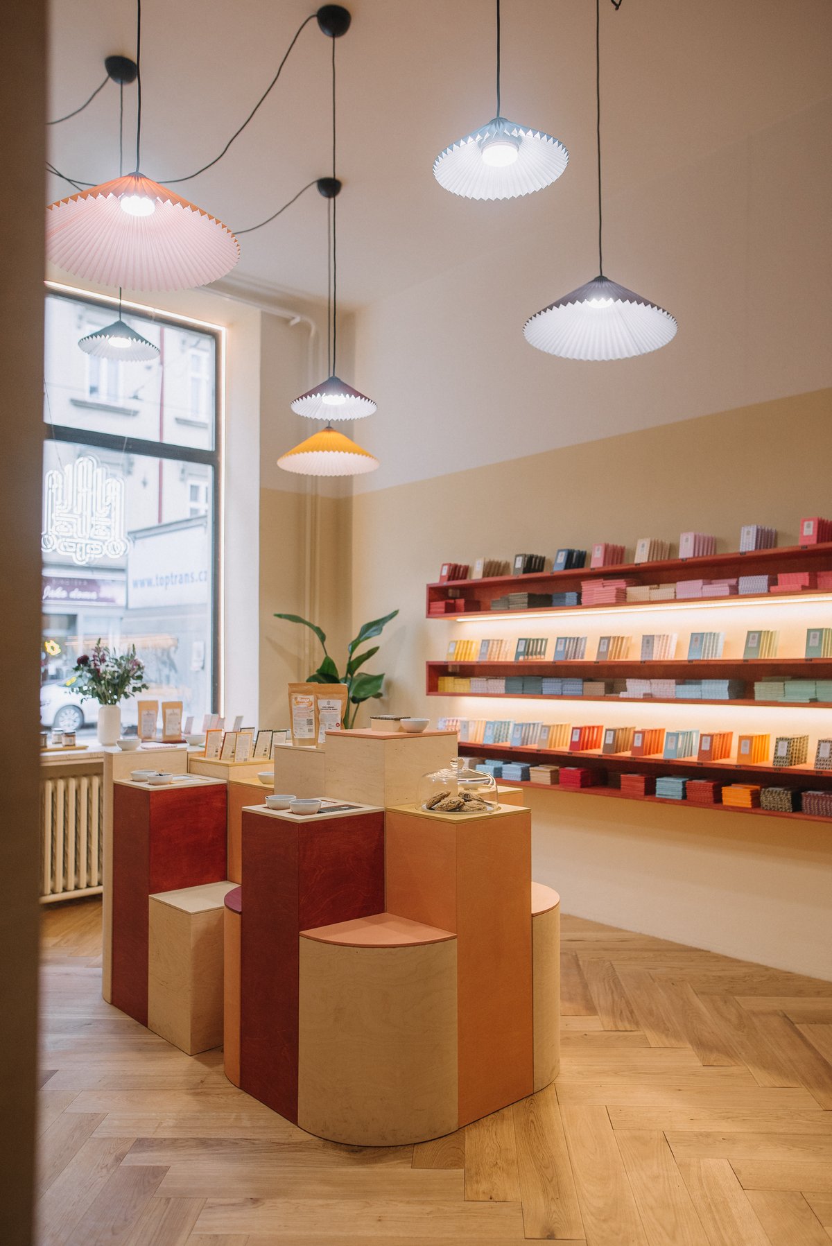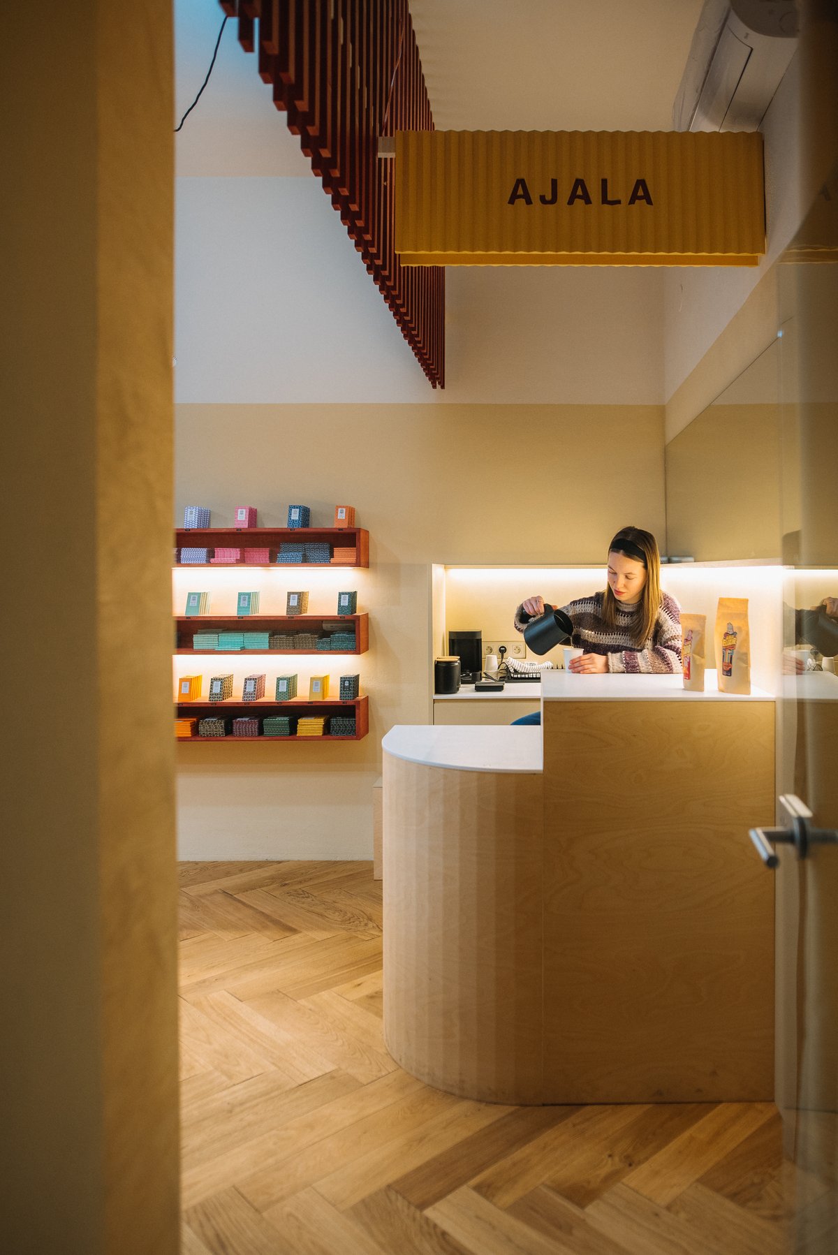 O vzhled prostoru se postaralo architektonické studio JUNG architekti. K novému showroomu Ajala Chocolate přistoupili jako k architektonickému vyjádření čokoládového rituálu, kde prostor podporuje smyslový zážitek i funkci. Interiér se vyznačuje minimalistickými liniemi a přirozenou pískovou barvou, která vytváří jemné a zároveň klidné prostředí – ideální pozadí pro pestré obaly čokolád.