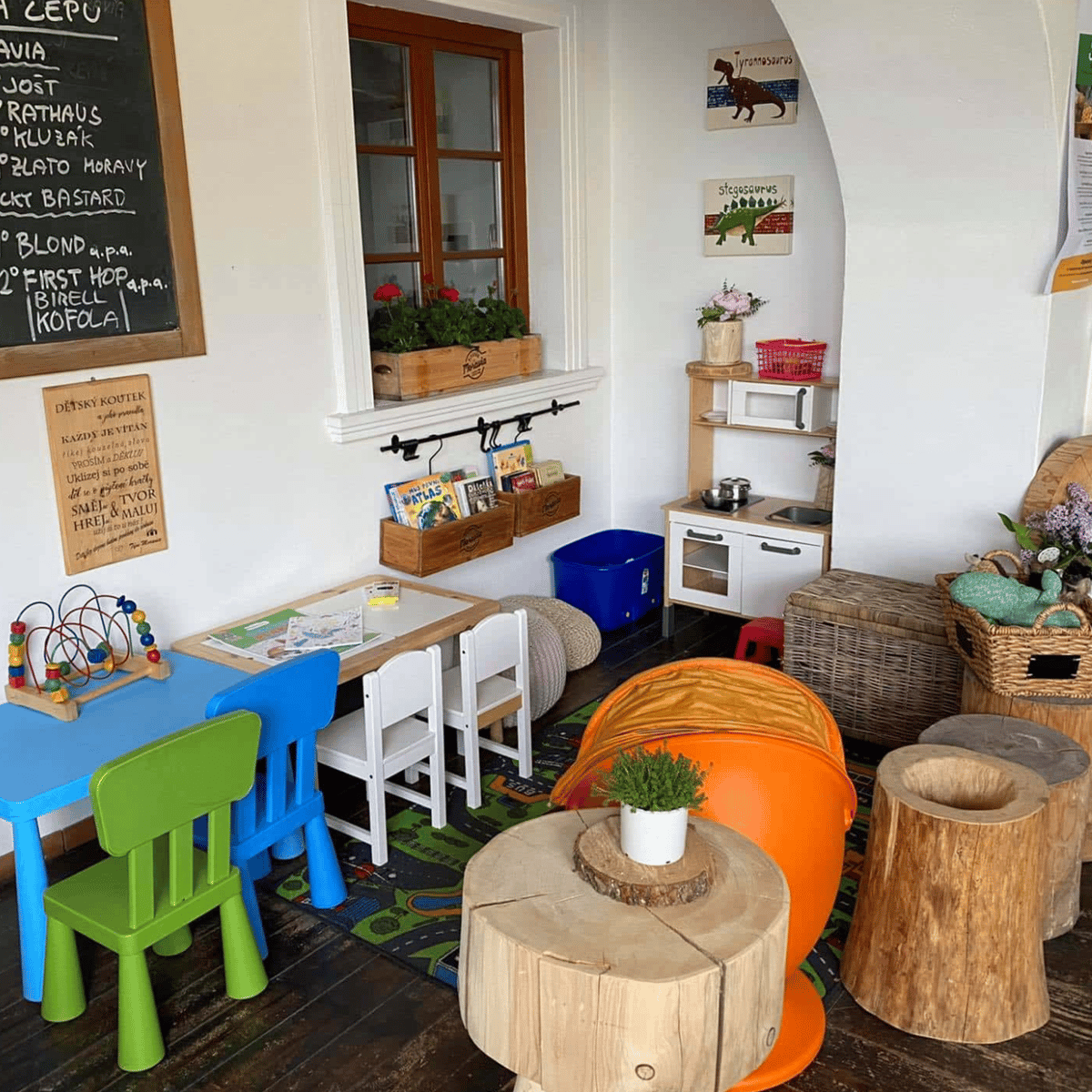 Restaurace nabízí českou klasiku i modernější jídla, domácí limonády a pivo z vlastního pivovaru. Dětská jídla tu v menu nejsou, ale není problém se domluvit na menších porcích. Děti se vyřádí ve dvou vnitřních koutcích plných hraček, a venku je potěší i dvě nedaleká hřiště – Zámecké a Halda. Pejsci jsou tu též vítáni.