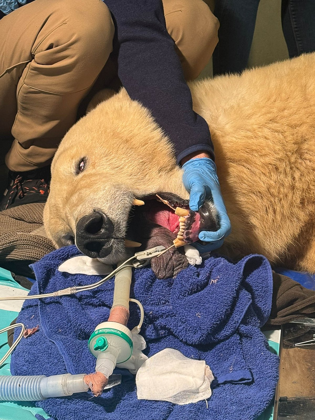 Právě u naší nové medvědice Elsy, která k nám dorazila z německého Bremerhavenu, jsme však museli v posledních týdnech řešit i zdravotní komplikace. Po jejím příchodu se začal objevovat snížený apetit a celkové horší prospívání, což ošetřovatele navedlo k podezření na problém v ústní dutině. Po důkladném vyšetření specializovaným týmem veterinárních lékařů byla u Elsy potvrzena fraktura tří zubů a infekce v oblasti obou spodních špičáků.