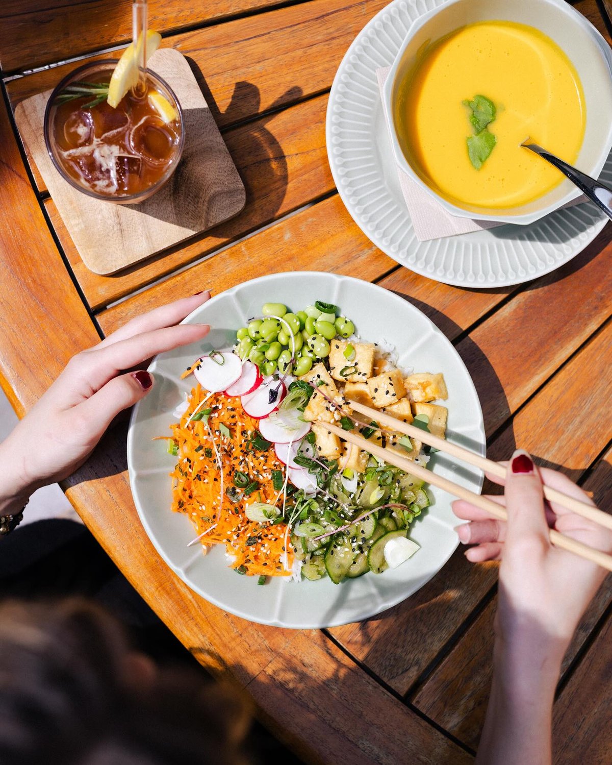 Milovníci polévek by měli zkusit Súp thịt soya vegan, kde v zeleninovém vývaru plavou kuličky ze sóji, hub a výrazného vietnamského pepře. Pokud preferujete něco sytějšího, Cơm vịt vegan s křupavou sójovou „kachnou“ a veganskou ústřičnou omáčkou na houbovém základu je pro vás ideální volbou, která rozhodně nezklame.